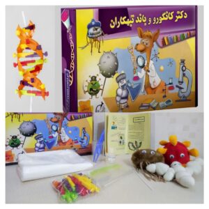 تجهیزات: کتاب داستان علمی تخیلی و راهنمای آزمایش، پازل دی ان ای ، سه عدد عروسک میکرو ارگانیسم، ظرف الکل،لباس آزمایشگاه، ظرف مدرج، پنس، زیپ کیپ